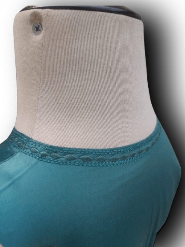 A green Emirati thobe with intricate embroidery adorning the front neckline and arm edges, combining traditional craftsmanship with modern elegance.